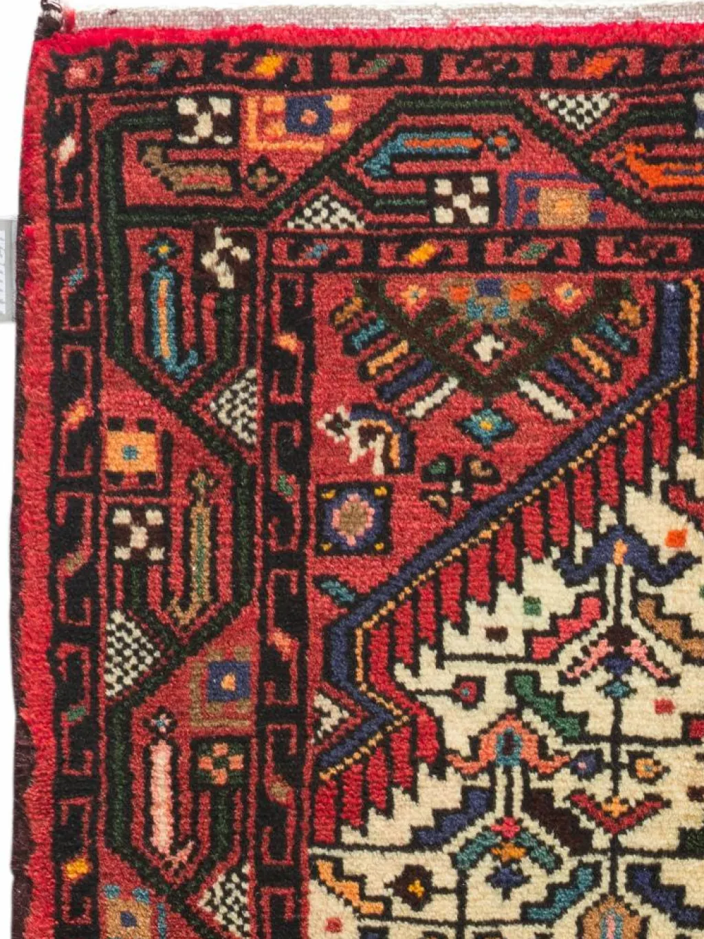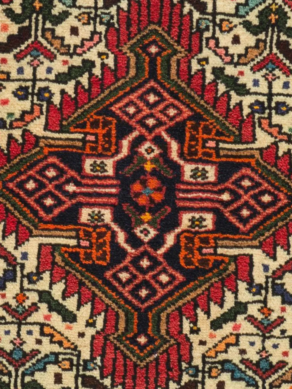 . Die Farben des Teppichs sind warm. Die Muster sind charakteristisch: Das Innenfeld ist mit einemMahi
