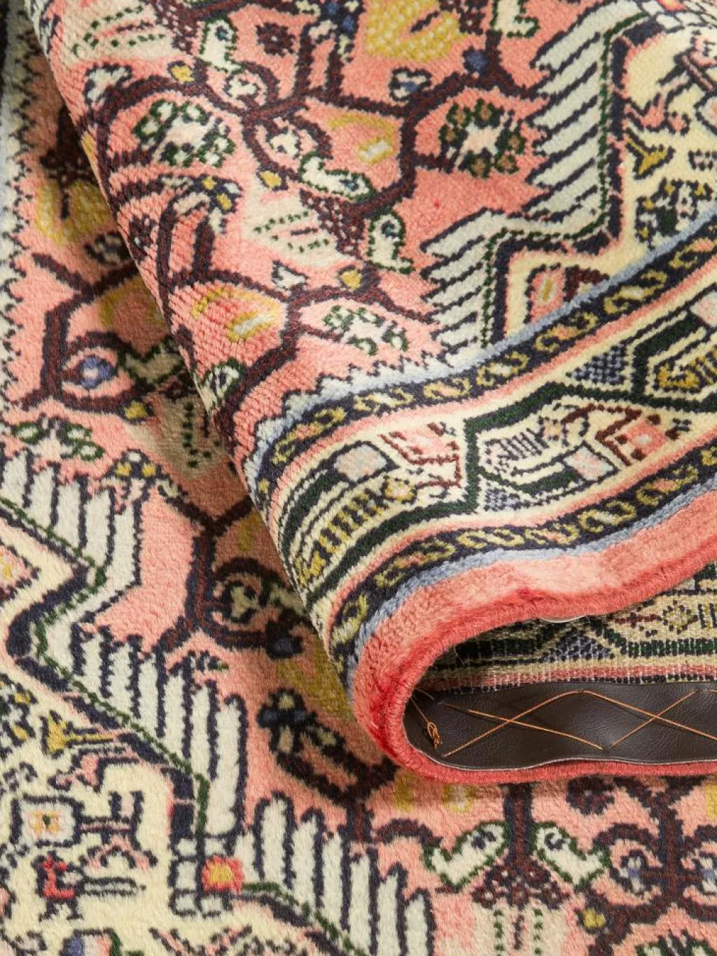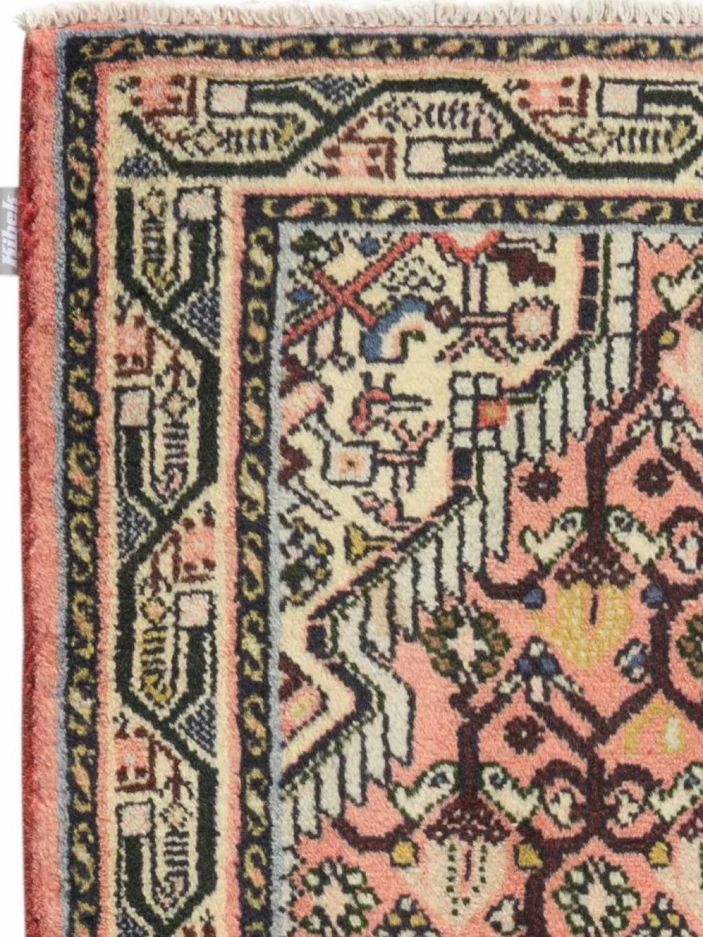 . Die Farben des Teppichs sind warm. Die Muster sind charakteristisch: Das Innenfeld ist mit einemMahi