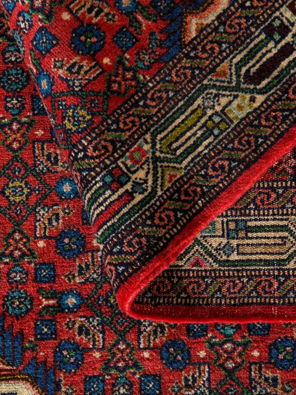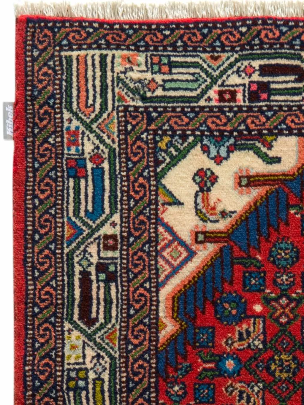 . Die Farben des Teppichs sind warm. Die Muster sind charakteristisch: Das Innenfeld ist mit einemMahi