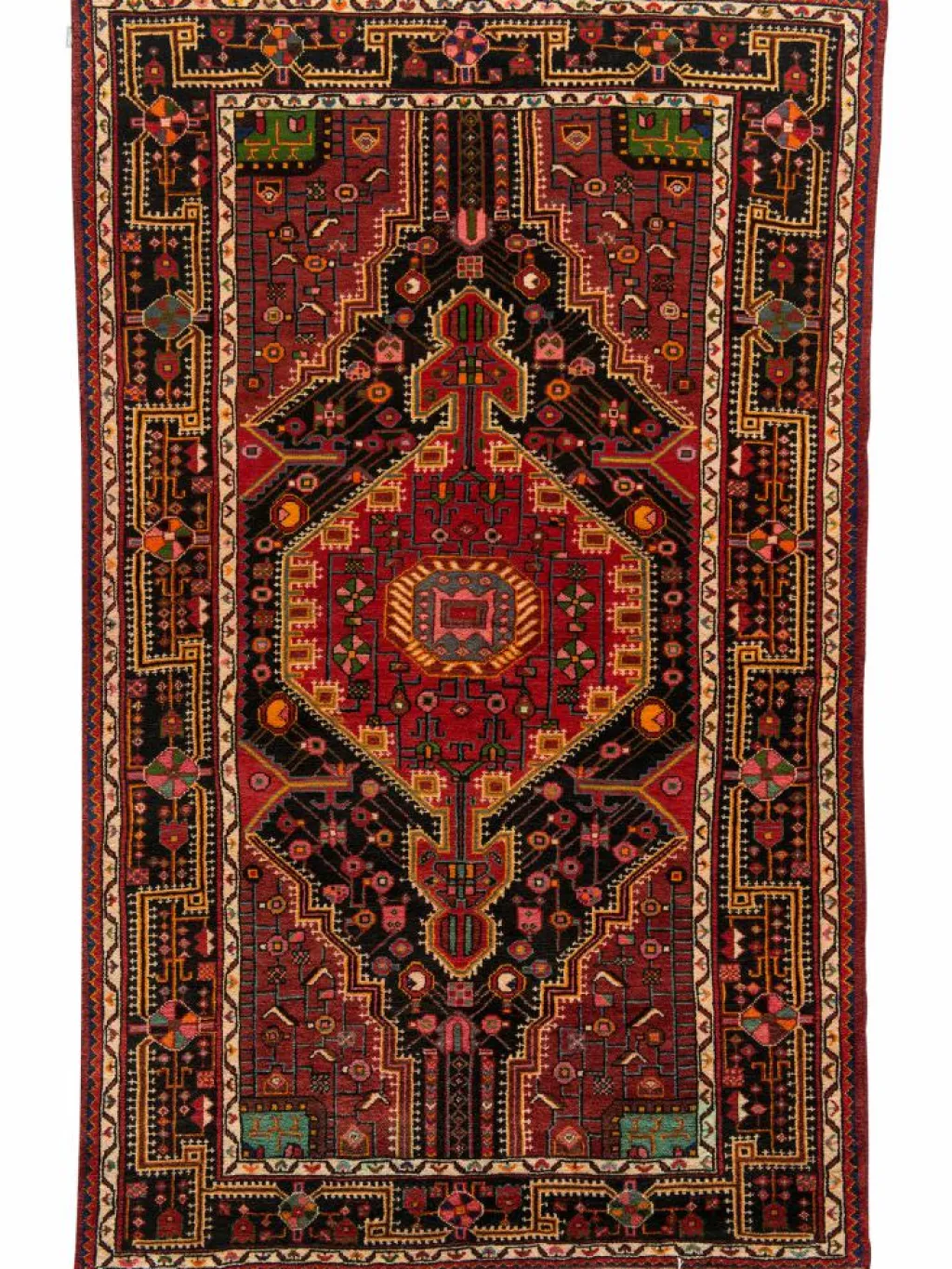 -Gebiets. Hier werden robuste Teppiche geknüpft. Charakteristisch ist ein beigefarbener oder schwarzer Grund, wenig gemustert, von dem sich das typische hexagonale Mittelmedaillon stark abhebt.- Die Gegend umHamadan