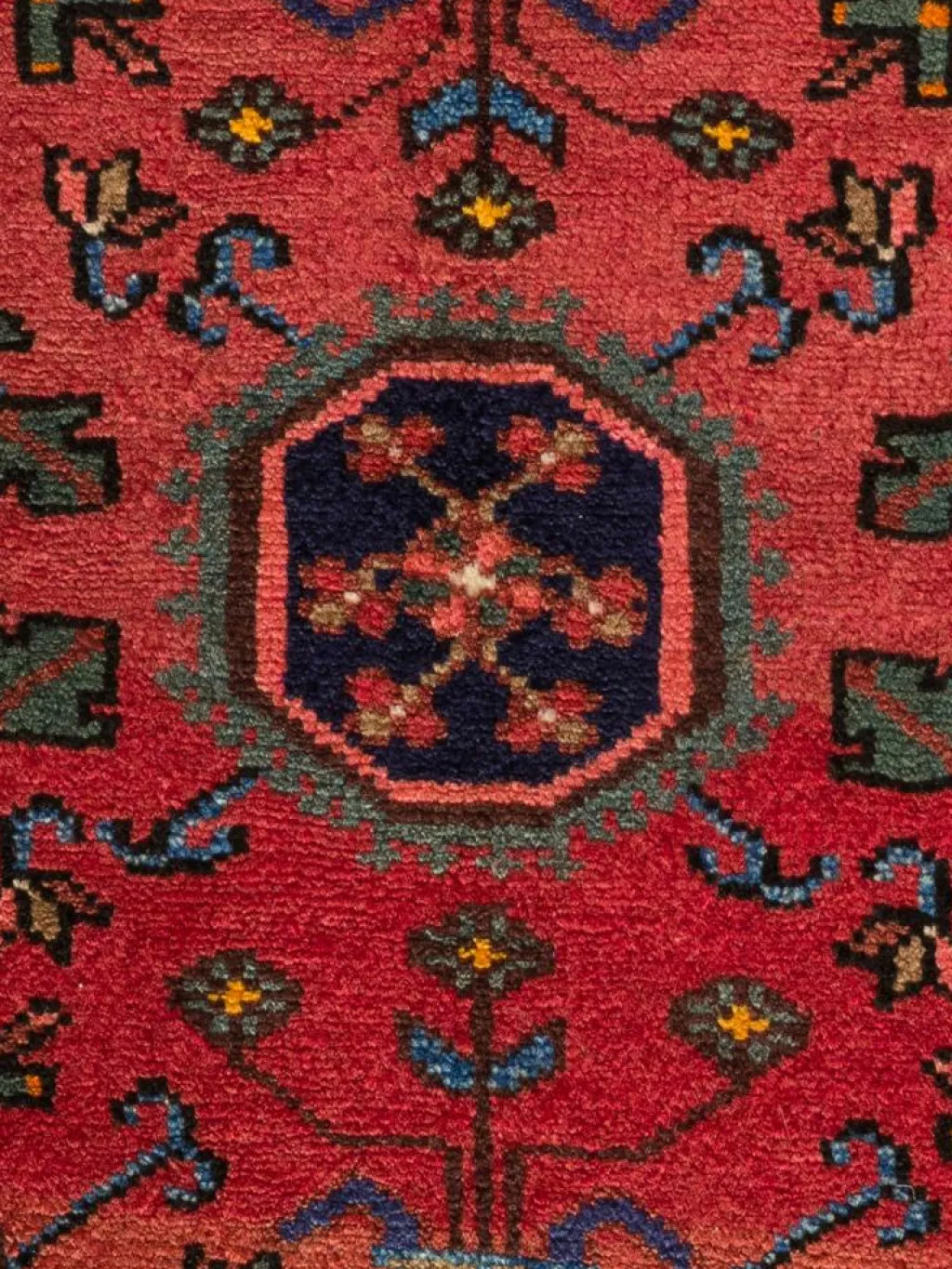 -Gebiets. Hier werden robuste Teppiche geknüpft. Charakteristisch ist ein beigefarbener oder schwarzer Grund, wenig gemustert, von dem sich das typische hexagonale Mittelmedaillon stark abhebt.Die Gegend umHamadan