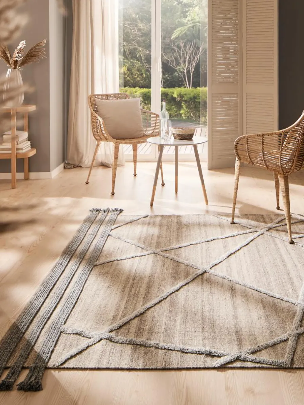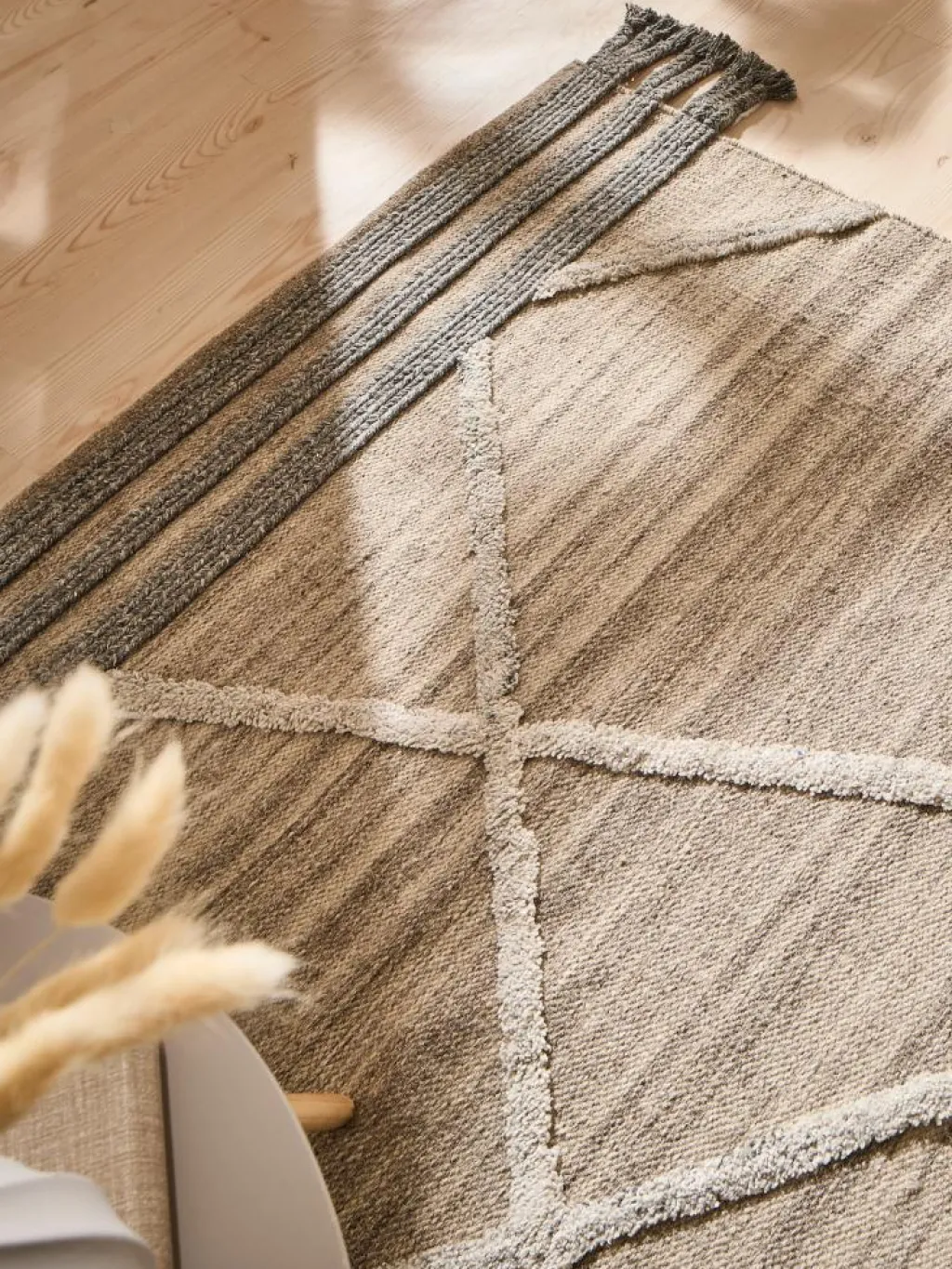 , Polyester und Baumwolle, bietet er nicht nur ein harmonisches Farbbild, sondern auch eine angesagte Hoch-Tief-Struktur, die ihm einen einzigartigen Relief-Look verleiht. Die unterschiedlichen Florhöhen sorgen für eine spannende Textur, während die schlichten Farben das Design abrunden und sich nahtlos in moderne Einrichtungsstile einfügen. Teppiche mit Schurwoll-Anteil können einen typischen Eigengeruch haben. Bei regelmäßigem Lüften verfliegt dieser Geruch nach einigen Tagen.| Eigenschaften: | für Fußbodenheizung geeignet |